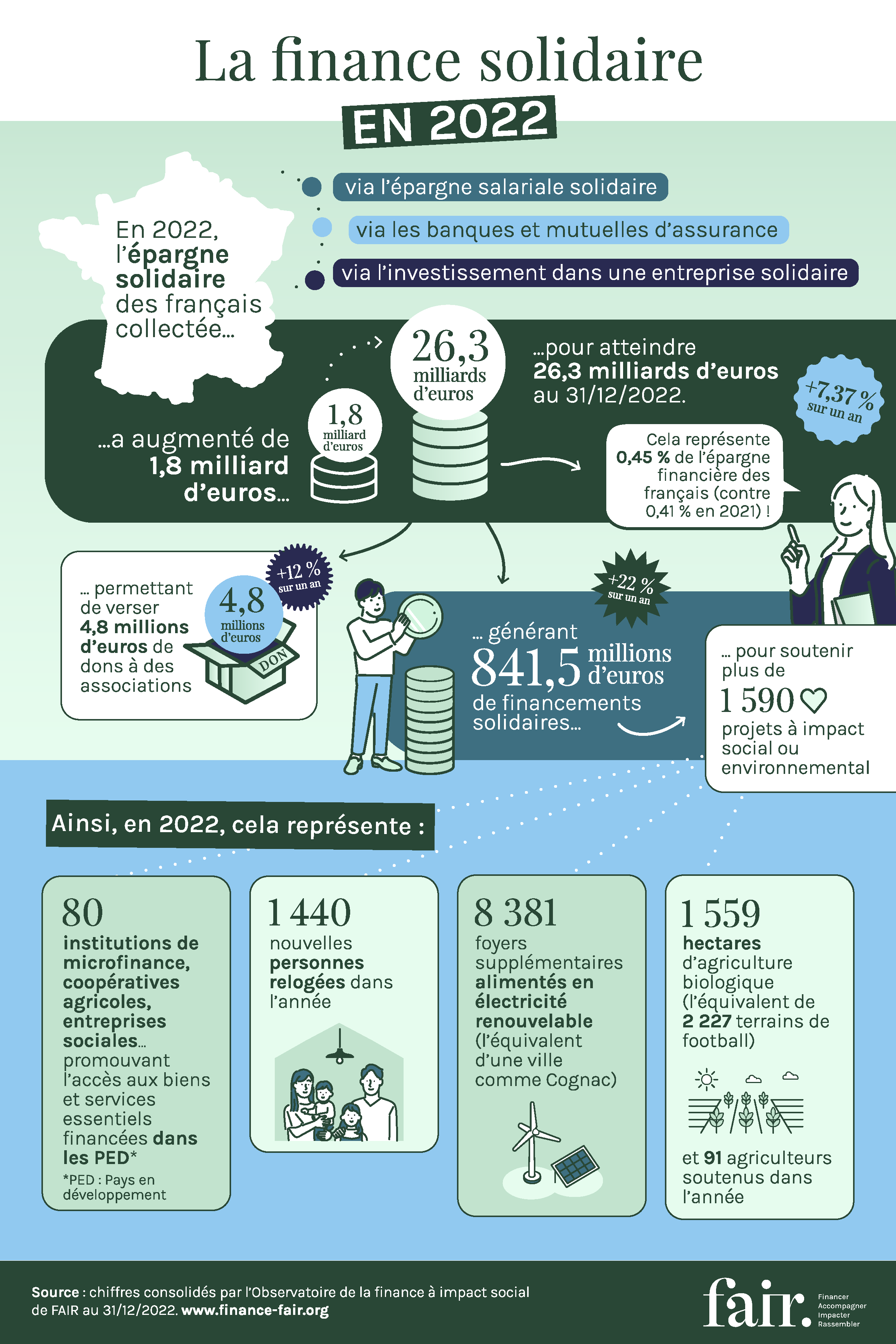 Comme le démontrent les résultats du 21e Baromètre de la finance solidaire FAIR / La Croix, la collecte poursuit sa croissance en 2022 et arrive, malgré un contexte morose, à tirer son épingle du jeu. L'encours global de l'épargne solidaire a atteint en 2022 26,3 milliards d'euros, soit une progression de 7,37 % en un an. Les financements solidaires réalisés en 2022 (841,53 millions d’euros soit + 22%) ont permis de soutenir plus de 1 590 projets à impact social ou environnemental permettant :