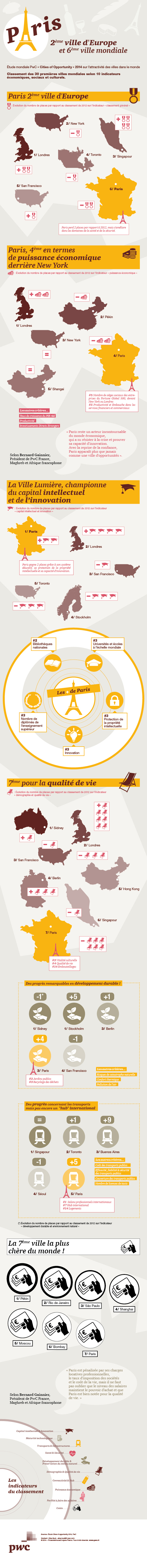Fidèle à sa réputation, la Ville Lumière prend la tête dans les domaines du capital intellectuel et de l’innovation, juste devant Londres, supplantant Stockholm et Toronto, classées respectivement aux 1ère et 2ème places en 2012. Pour retrouver toutes les informations majeures de l'étude, voici une infographie :